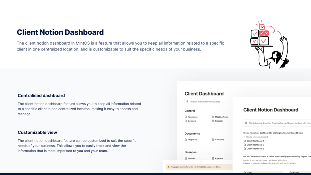 The client notion dashboard feature in MintOS allows you to create individual dashboards for each client. Each dashboard includes specific project details, client communications, and project progress, all in one centralized location. This feature makes it easy to manage multiple clients and projects at once, and also allows you to keep sensitive information confidential and secure. Additionally, it allows you to share the progress of the project with the client, giving them transparency into the work you are doing for them. The client notion dashboard feature in MintOS helps in managing client relationships and keeps all relevant information in one place, making it easy to access for all parties involved.