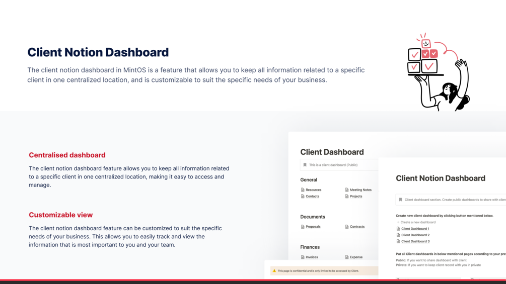 The client notion dashboard feature in Project Management OS allows you to create individual dashboards for each client. Each dashboard includes specific project details, client communications, and project progress, all in one centralized location. This feature makes it easy to manage multiple clients and projects at once, and also allows you to keep sensitive information confidential and secure. Additionally, it allows you to share the progress of the project with the client, giving them transparency into the work you are doing for them. The client notion dashboard feature in Project Management OS helps in managing client relationships and keeps all relevant information in one place, making it easy to access for all parties involved.